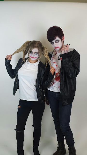 Main Image- I have used a medium, two shot of my of my fictional band, Delirium. Becky is wearing a leather jacket, a white T-shirt and black, ripped skinny jeans. Jack is wearing a leather jacket, a ripped,white T-shirt with red patches, to look like blood to reinforce the psychotic gimmick inspired by the Joker and Harley Quinn and jeans. Both are wearing face paint similar to the Joker and Harley Quinn with the red paint applied on Becky in the shape of a smile and on Jack in the shape of a frown to represent happiness and sadness inspired by bi-polar. Becky is holding a pair of scissors motioning that she is going to cut through Jack's throat which adds emphasis to the gimmick.